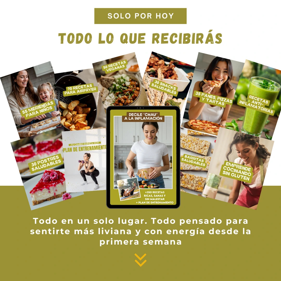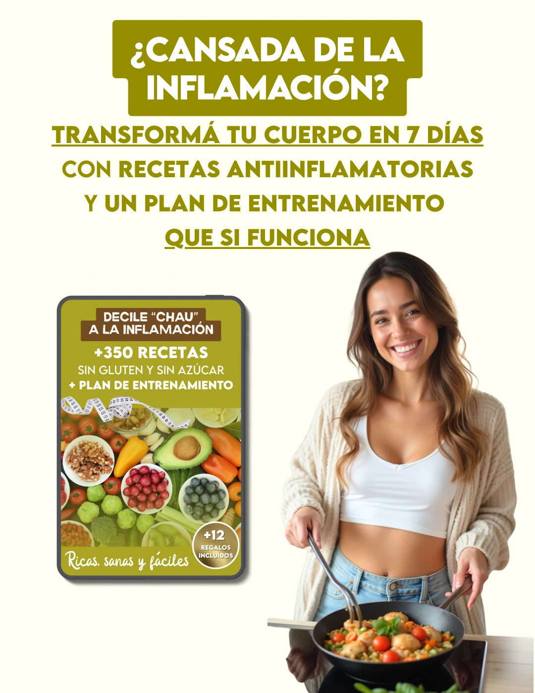 ÉSTAS RECETAS Y ENTRENAMIENTO ME CAMBIARON LA VIDA!! Hace meses venía inflamada todo el tiempo y ya no sabía más qué probar..TODO ME INFLAMABA. Hasta que un bendito día me apareció la publi del ebook y lo compre..Empecé a seguir las recetas, y ya desde los primeros 7 días empecé a notar la diferencia, me siento mucho más liviana, con más energía y sin esa inflamación incómoda... y encima las recetas son riquísimas! Lo súper recomiendo!!